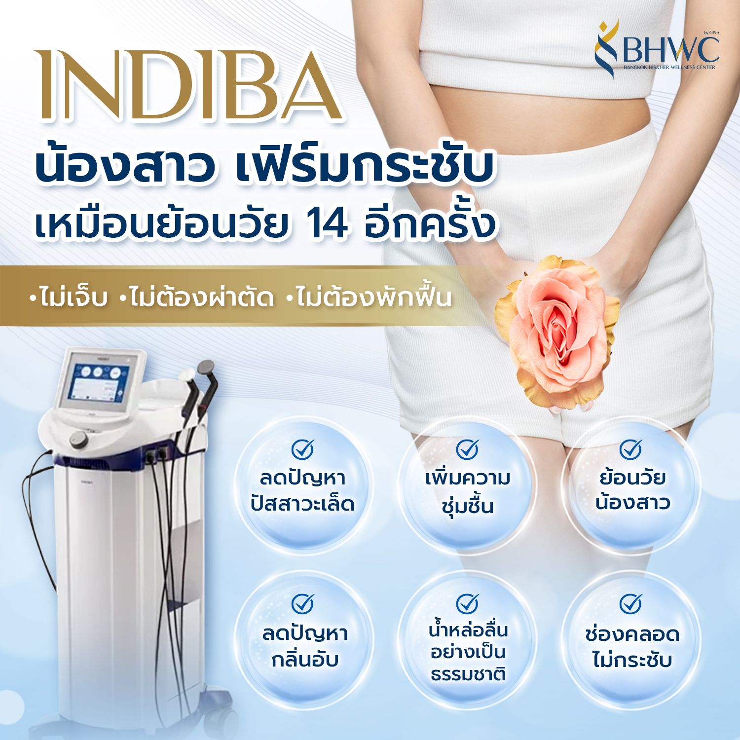 เมื่อใช้กับบริเวณจุดซ่อนเร้น INDIBA จะช่วยกระตุ้นการสร้างคอลลาเจนและอีลาสติน เพิ่มความยืดหยุ่น ความชุ่มชื้น และความกระชับให้กับน้องสาว